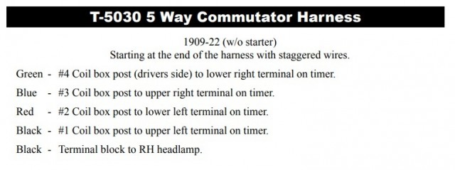 Commutator wire set | 09-27 Artikkelnr.: T-5030 PrisNOK799,00 inkl. mva. Utsolgt Del dette Produktinfo This harness runs from the timer on the front of your motor back to the coil box on the firewall. Use this harness for any model T that is not running a generator/starter.